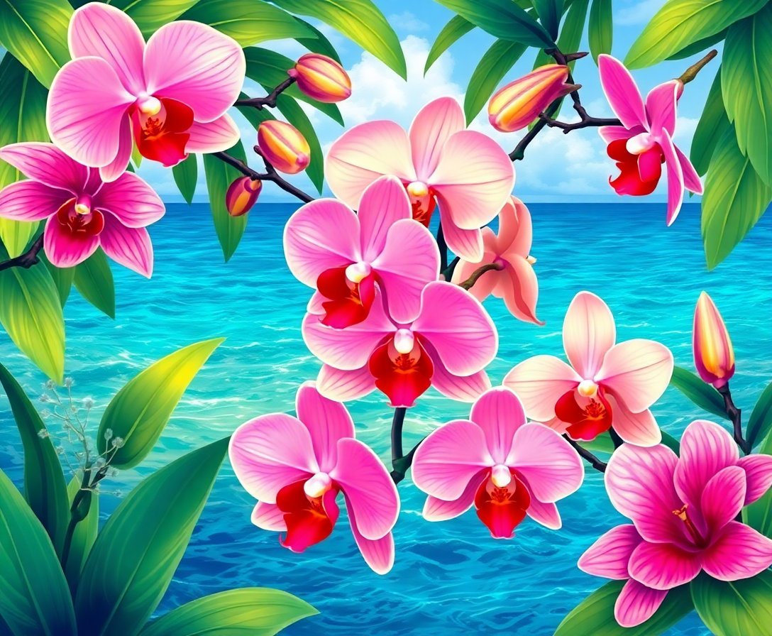 Ultimately, add finishing touches to delicate orchid petals and ocean reflections. Your completed artwork radiates tropical serenity. Display your achievement proudly in any room.