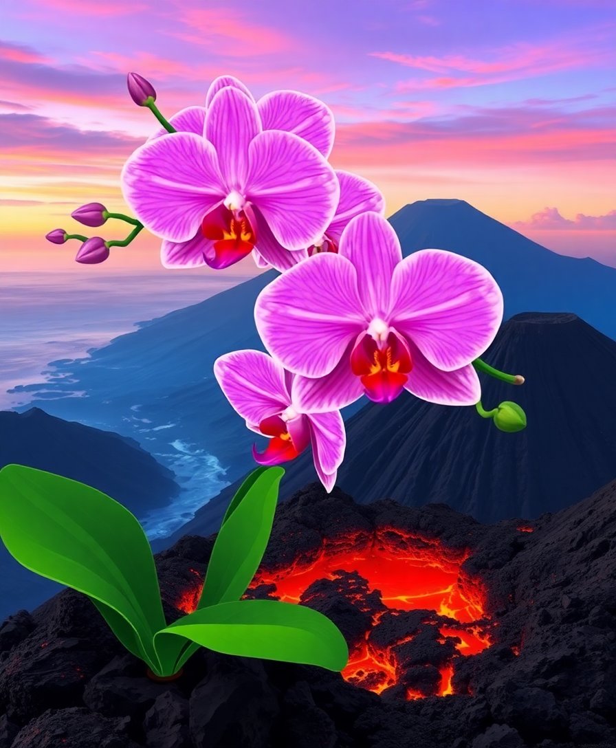 Ultimately, add the final orchid details that bring life and contrast to your volcanic scene. These delicate finishing touches create stunning focal points against the dramatic magma landscape. Your completed masterpiece showcases nature’s incredible ability to thrive in extraordinary circumstances.