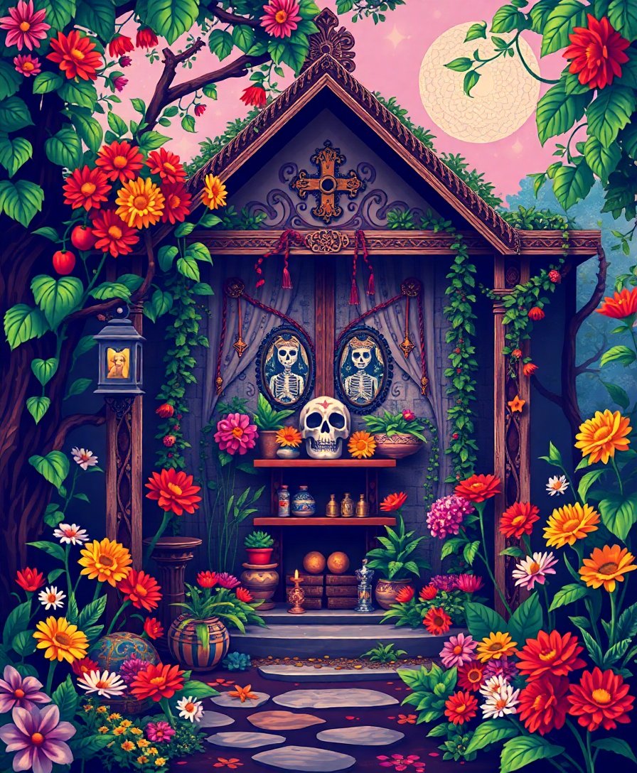 Subsequently, add intricate details using your smallest brush. Layer marigold petals carefully over weathered stone textures. Each stroke brings your vintage shrine closer to completion.