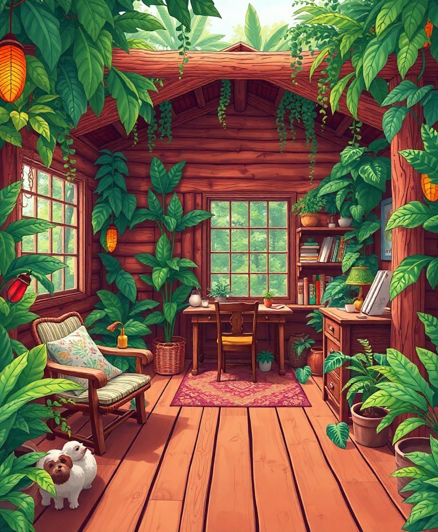This realistic cabin scene captures authentic rustic charm perfectly. The overgrown elements add unique character to traditional study themes. Furthermore, high-quality materials ensure vibrant, long-lasting results. Most importantly, rustic tropical cabins designs offer timeless appeal for any home décor.