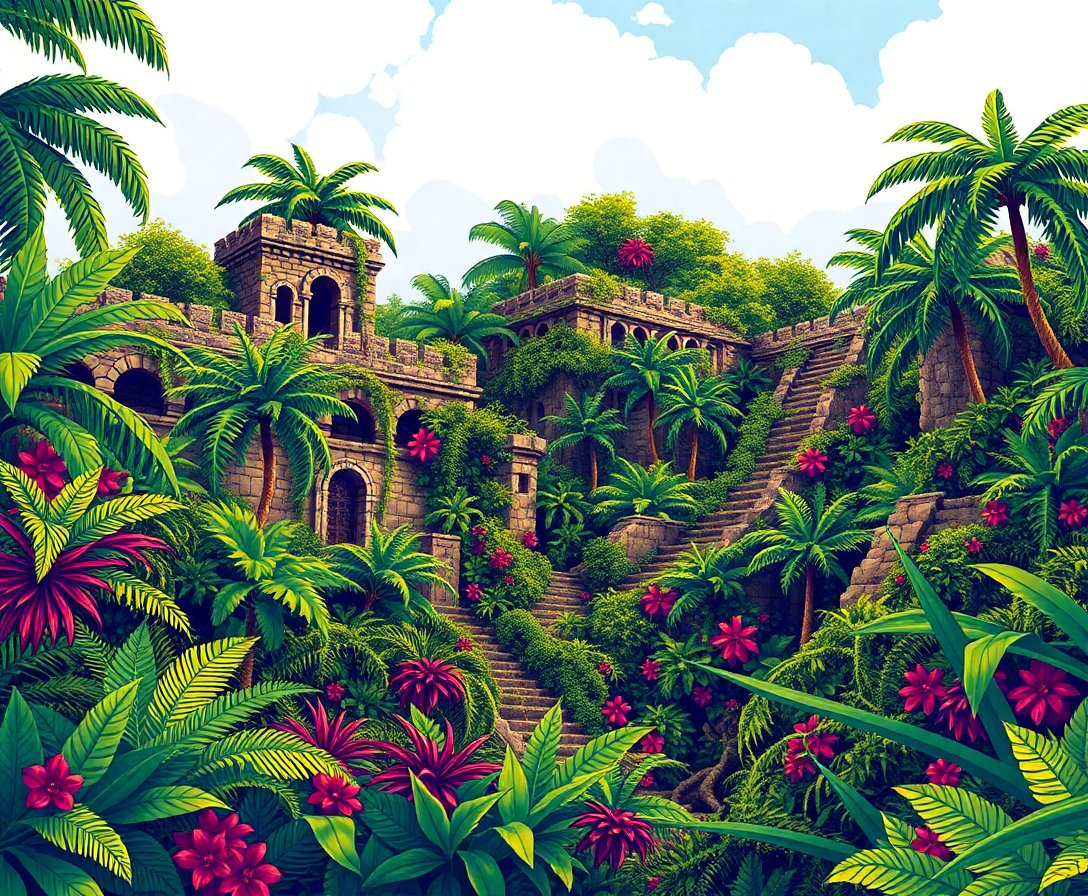 Subsequently, begin with lighter tropical tones to establish the botanical foundation. Furthermore, layer deeper greens and earthy fortress hues gradually. Each brushstroke reveals the ancient walls emerging through lush vegetation.