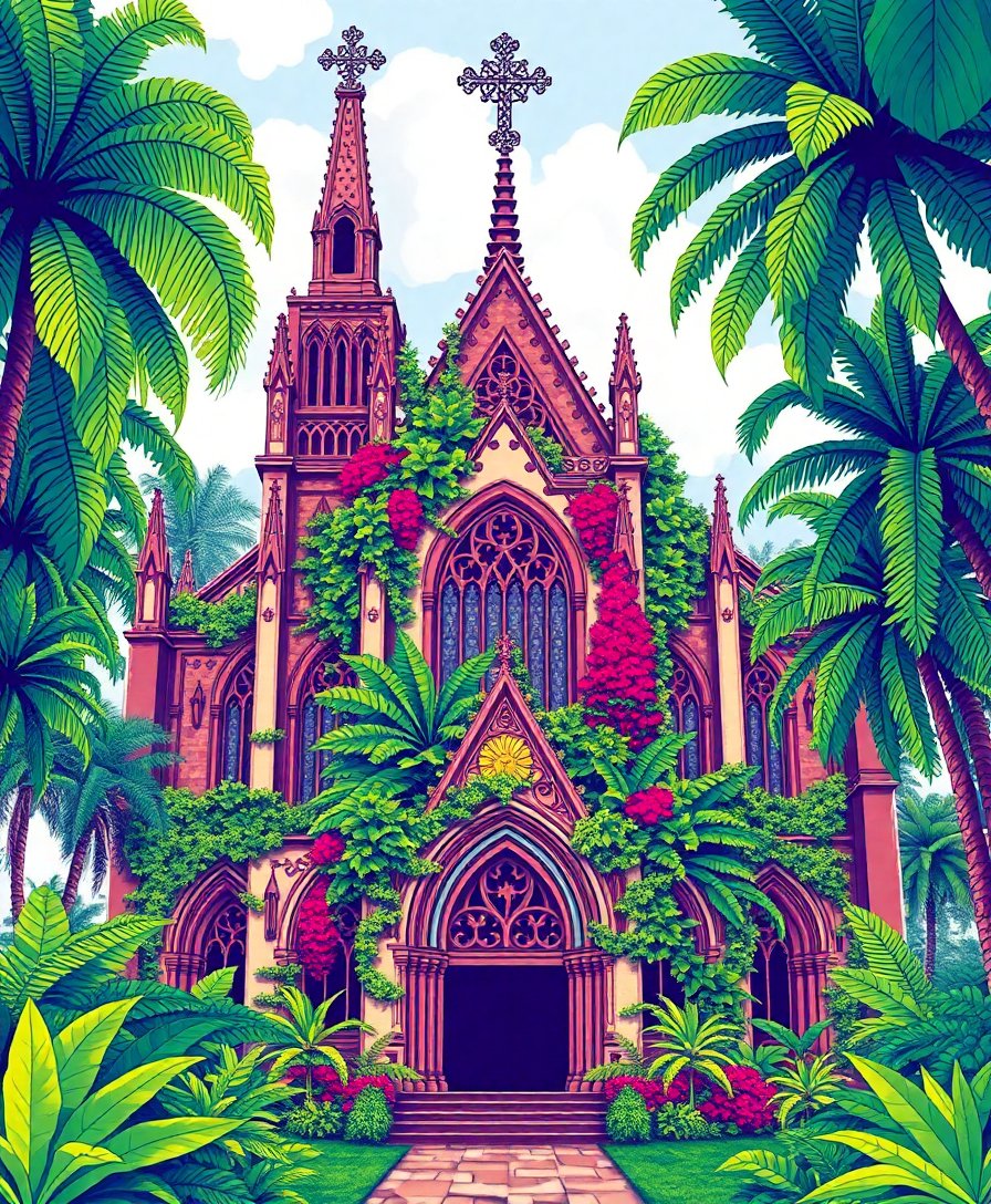 Ultimately, step back and admire your completed gothic sanctuary. The interplay between ancient architecture and tropical overgrowth creates a mesmerizing focal point. Your finished artwork captures both mystery and natural beauty in perfect harmony.