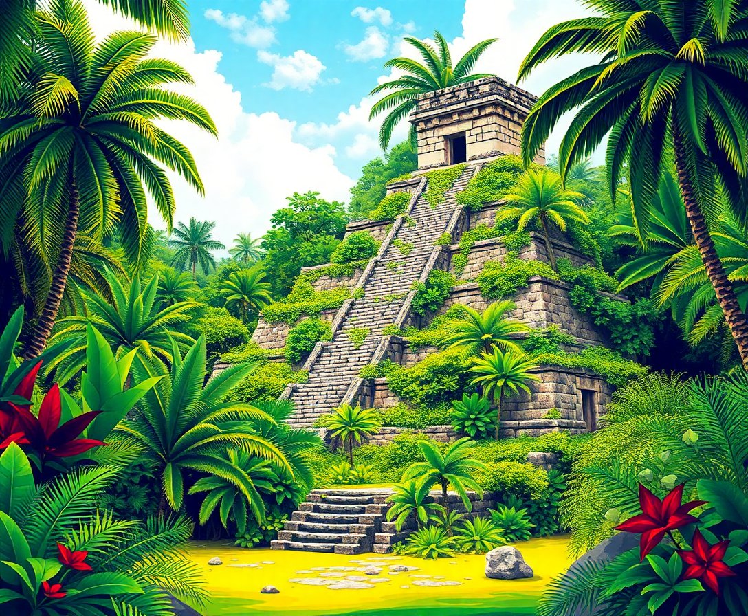 Ultimately, step back and admire your atmospheric masterpiece. The interplay between ancient architecture and tropical nature creates stunning visual depth. Your completed artwork captures the mysterious beauty of forgotten civilizations reclaimed by jungle growth.