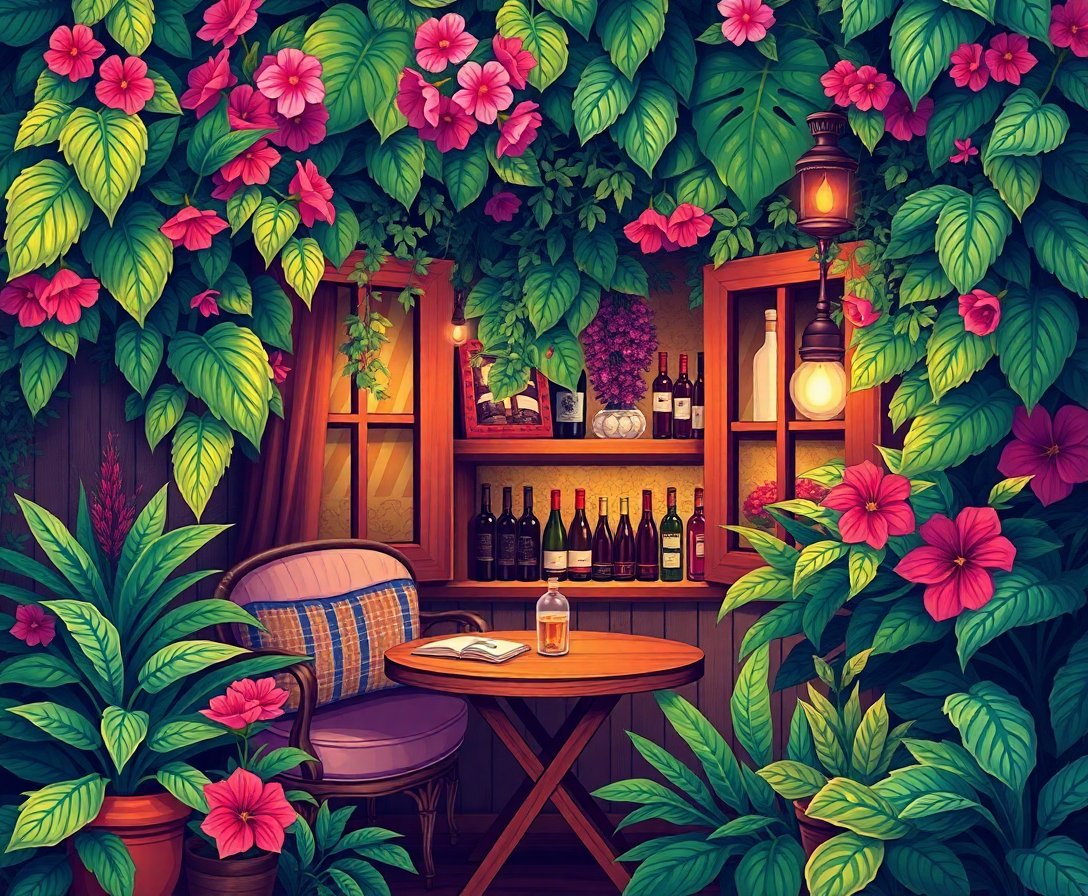 Subsequently, begin with larger sections using medium brushes for efficiency. Then, gradually work toward smaller details with precision brushes. Additionally, the cozy indoors theme emerges as tropical elements blend seamlessly with wine cellar ambiance.