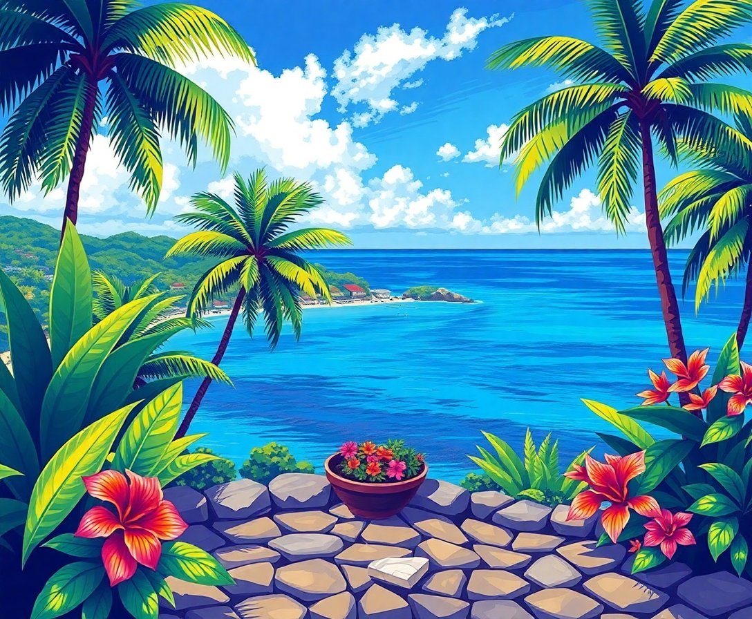 Ultimately, step back and admire your completed vintage tropical scene. Furthermore, the shadows and serene atmosphere you’ve created will transport viewers to that peaceful waterfront setting every time they gaze upon your masterpiece.