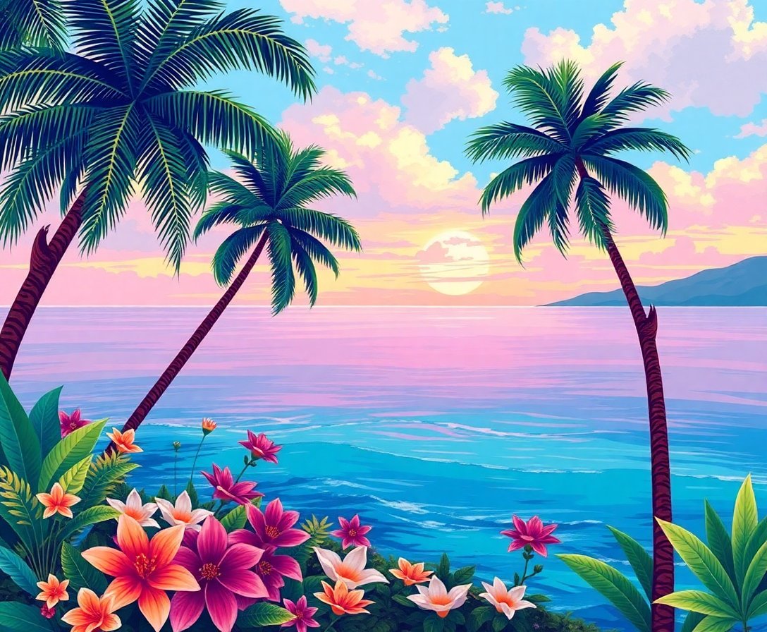 Ultimately, step back and admire your completed tropical vista. The misty atmosphere and resort elegance create a stunning focal point. Your finished piece radiates the peaceful ambiance of coastal serenity.