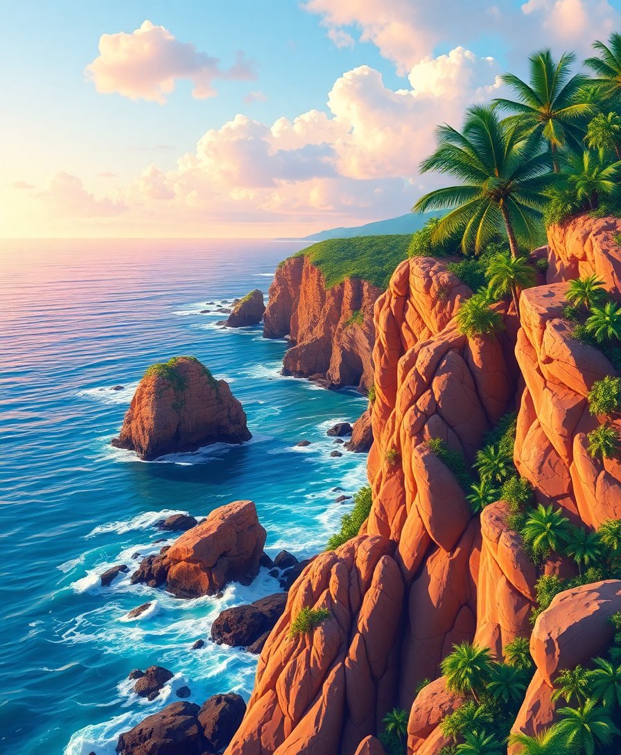 Ultimately, step back and admire your finished tropical masterpiece. The dramatic cliffs and surfing waves create a stunning focal point. Your artwork now captures the serene beauty of paradise.