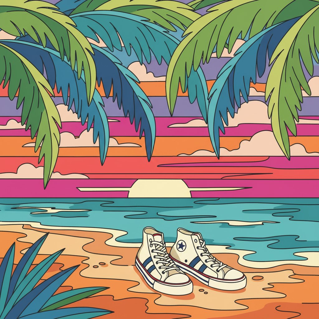 Transform your space with this vibrant Palms And Classic Kicks Paint By Numbers design. This tropical-inspired artwork combines iconic sneaker culture with paradise vibes. Experience the joy of creating stunning wall art that celebrates both retro fashion and beach aesthetics.