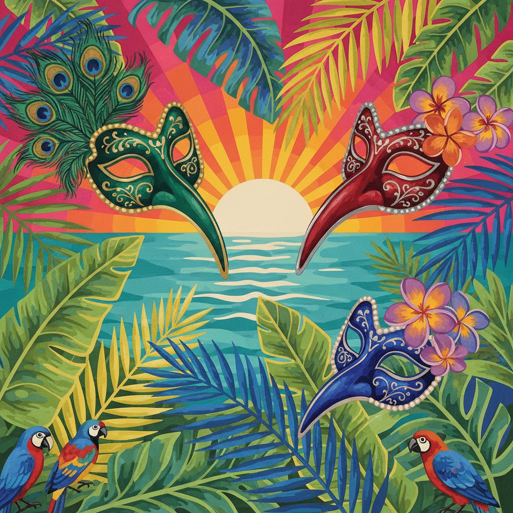 Ultimately, complete the fine details and step back to admire your masterpiece. Additionally, the tropical palms and velvet masks create stunning visual impact. Moreover, your finished artwork showcases professional artistic quality.