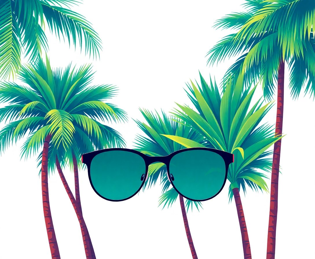 This unique design combines tropical palm trees with retro eyewear elements, creating nostalgic entertainment art perfect for movie lovers and vintage enthusiasts.