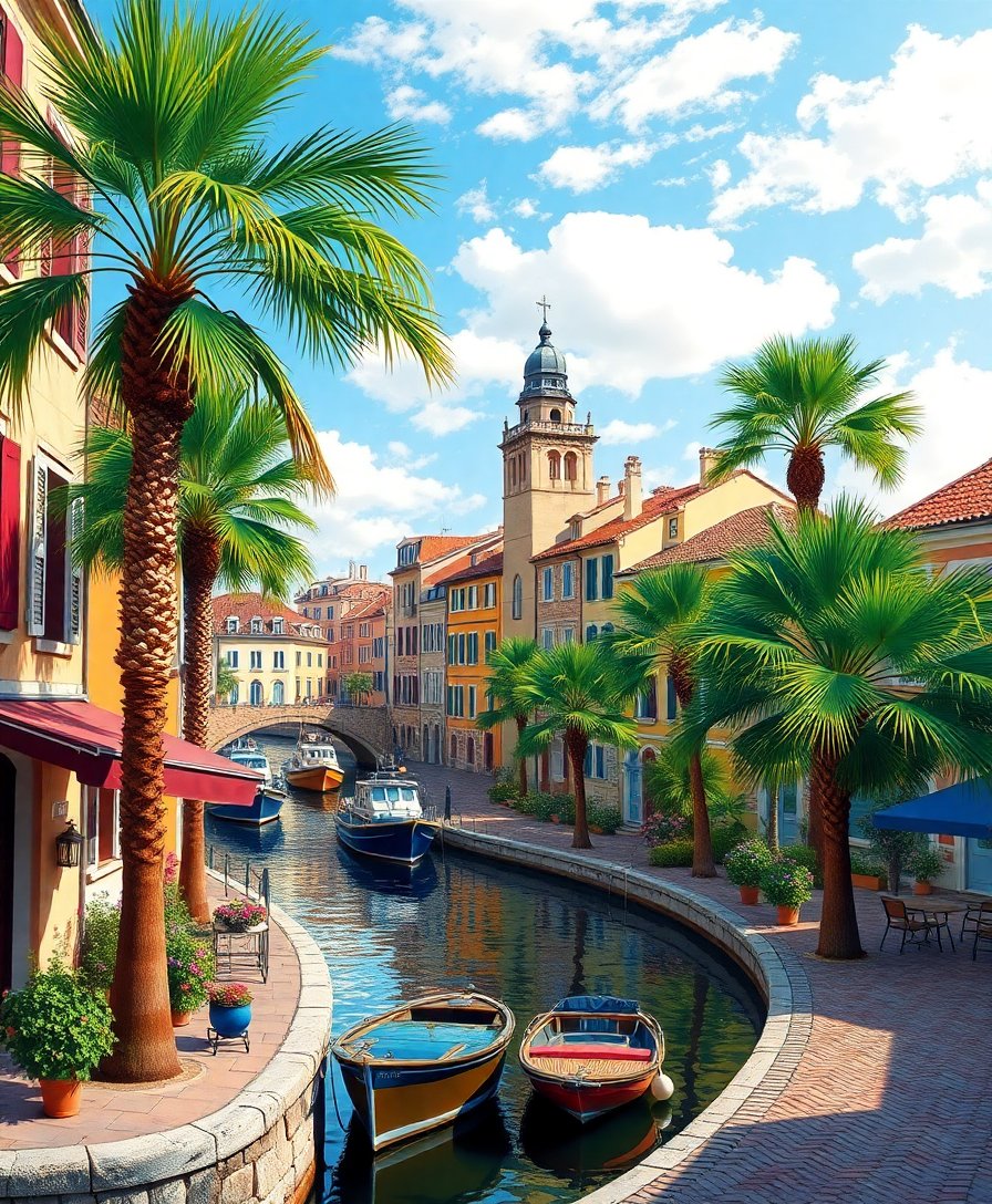 This design stands out among cobblestoned old Europe collections with its unique tropical elements. Additionally, the vintage harbor setting evokes nostalgic Mediterranean charm. The lush palm details create stunning visual contrast against historic architecture.