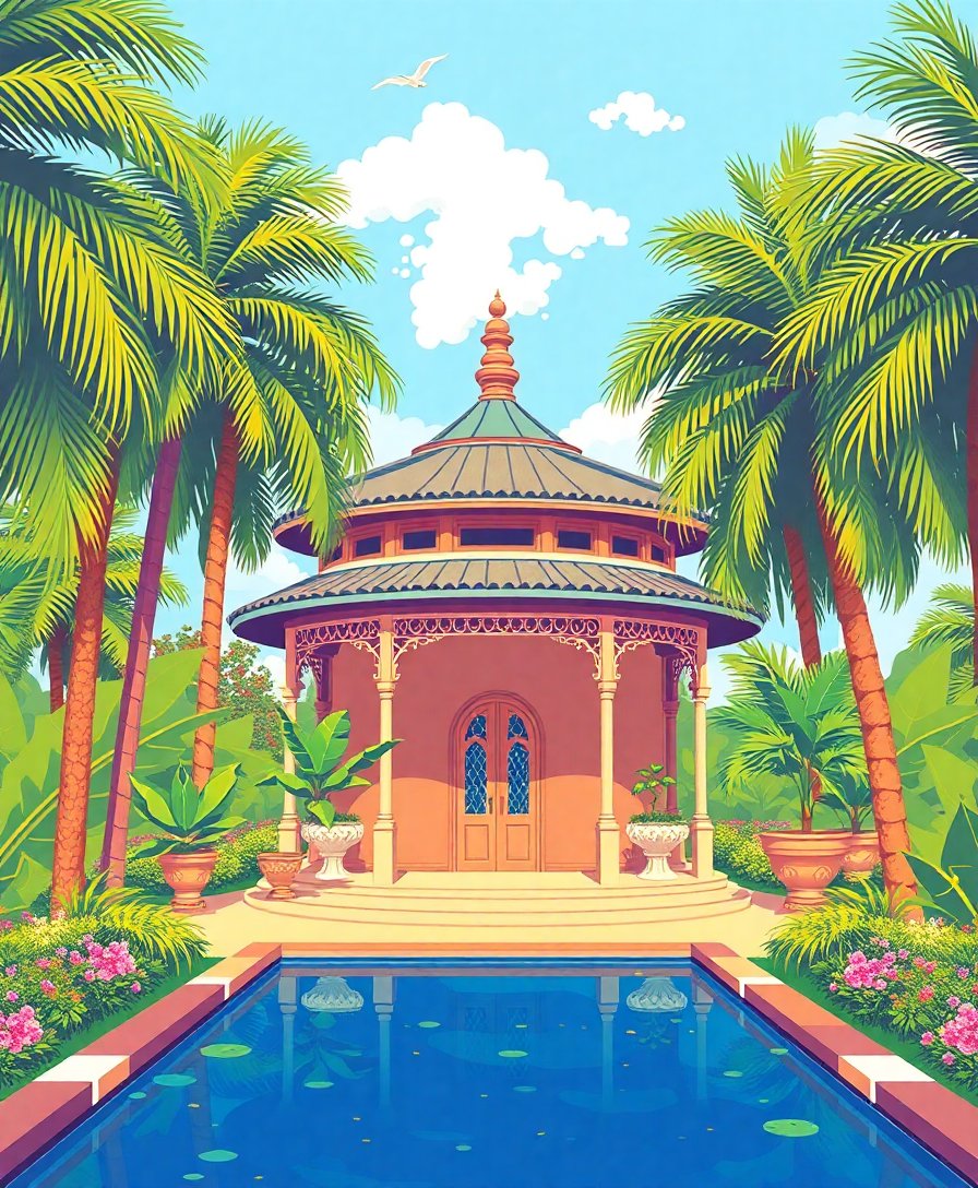 Subsequently, begin with lighter sepia tones in the vintage pavilion structure before progressing to deeper palm fronds. Moreover, work systematically from background architectural elements forward to botanical details. This approach builds depth while maintaining the romantic atmosphere of this architectural masterpiece.