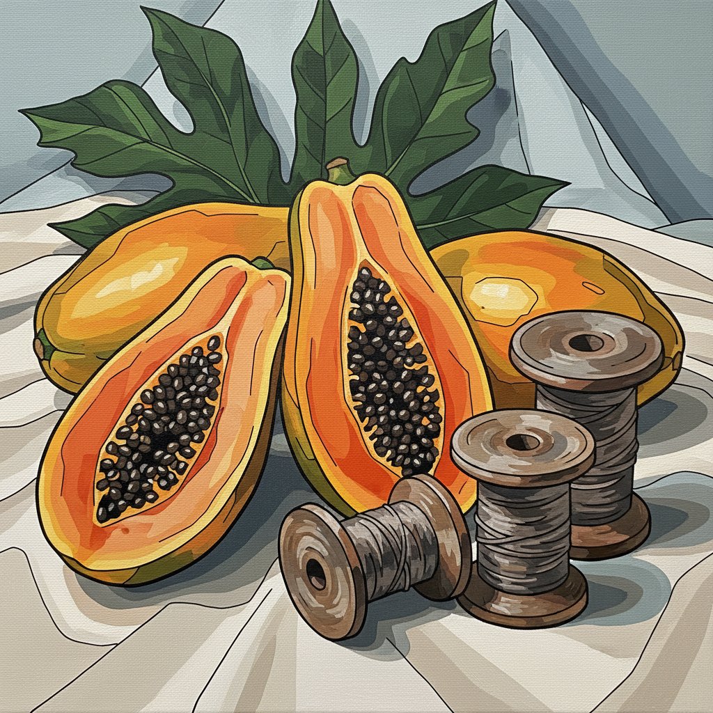This design celebrates heritage craftsmanship through stunning visual storytelling. The papaya’s vibrant colors contrast beautifully against antique wooden spools. Furthermore, this heritage sewing room scene adds warmth to any living space with its cozy indoor atmosphere.