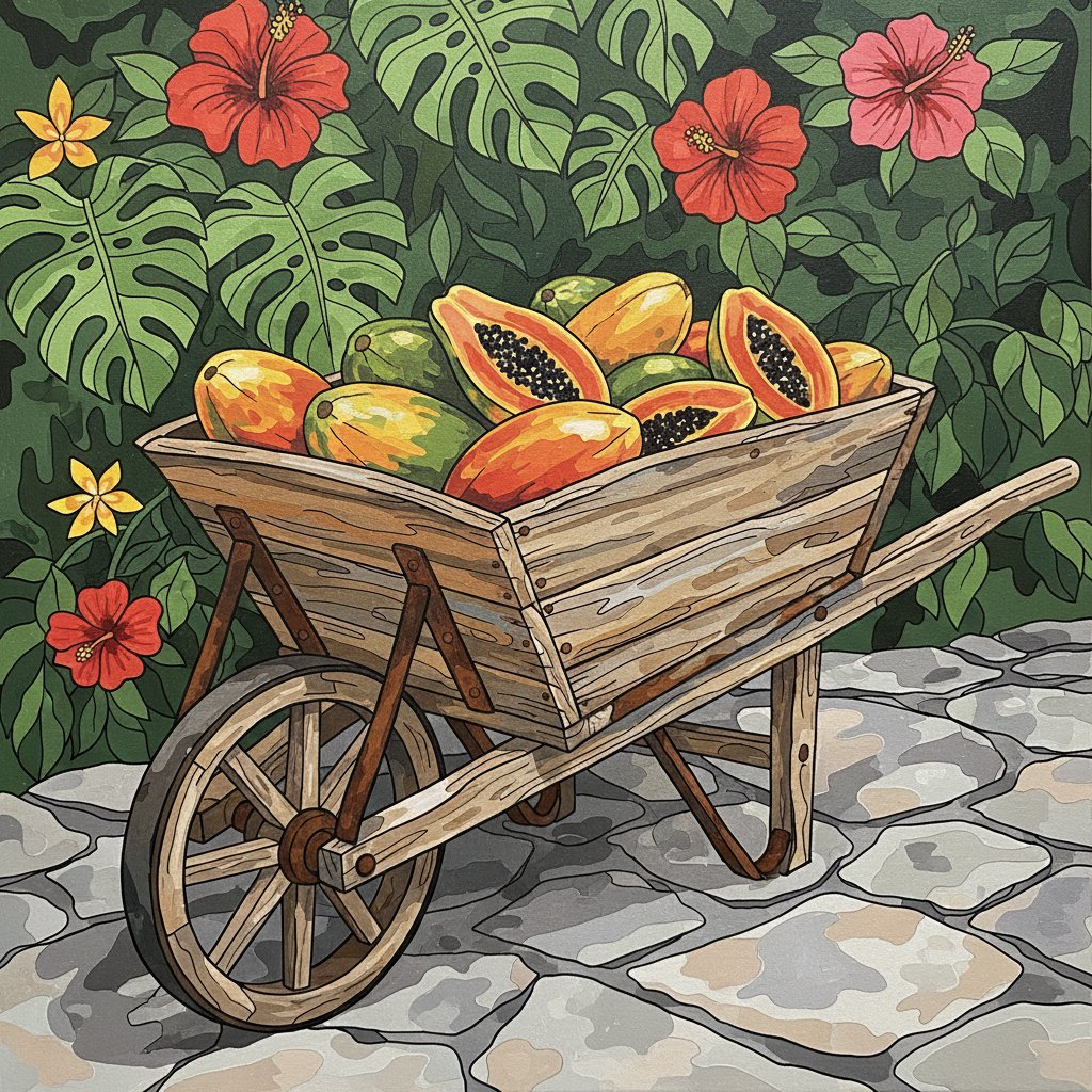 Transform your space with this charming Papayas In Antique Wheelbarrow Paint By Numbers kit. This delightful still life captures the rustic beauty of ripe papayas nestled in a weathered wheelbarrow. Each brushstroke brings you closer to creating your own pastoral masterpiece filled with idyllic countryside charm.