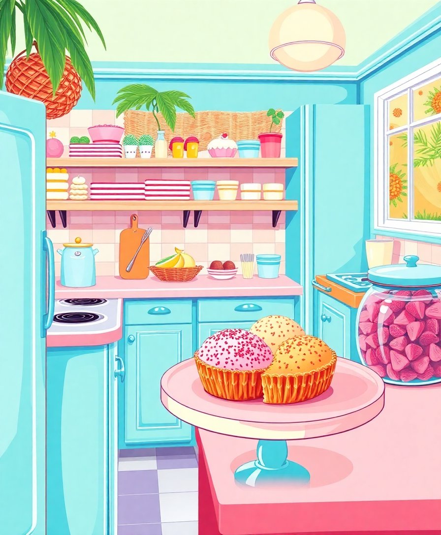 This kit captures authentic 1950s kitchen aesthetics with soft pastel colors and nostalgic charm. The realistic coconut and dessert elements create a cozy, inviting atmosphere perfect for any home.