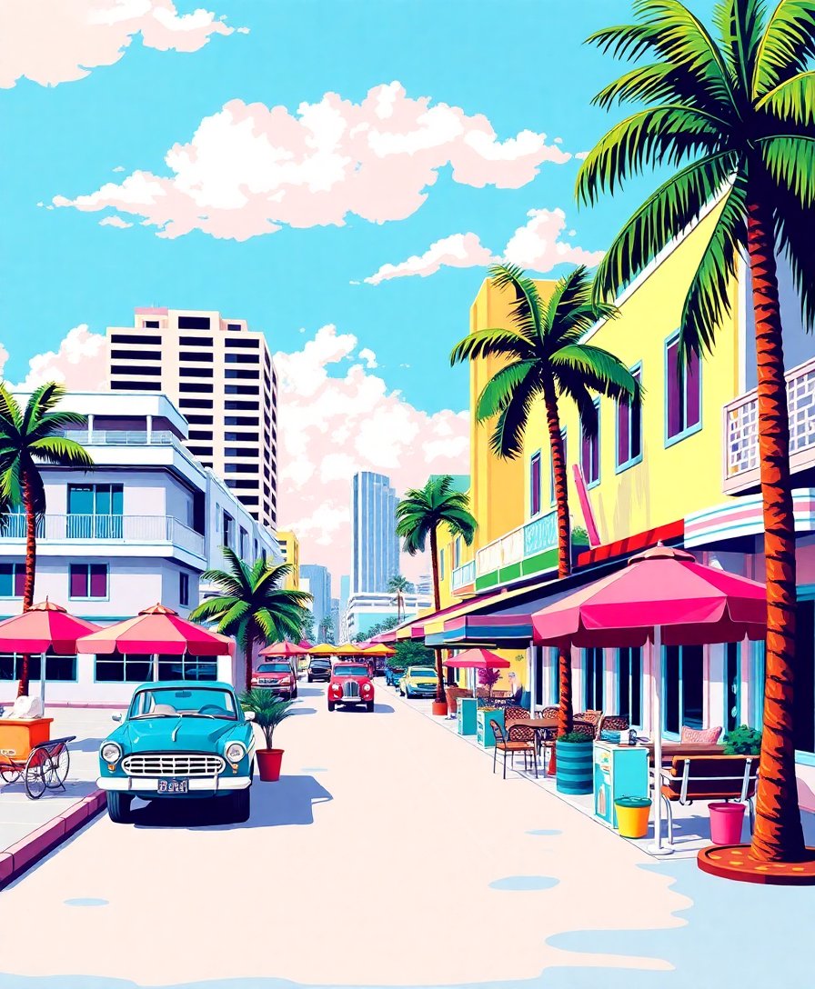 Ultimately, step back and admire your finished tropical masterpiece. Furthermore, the soft pastels create a dreamy atmosphere that transforms any room. Your completed artwork captures Miami’s iconic Art Deco influence with modern pop art flair.