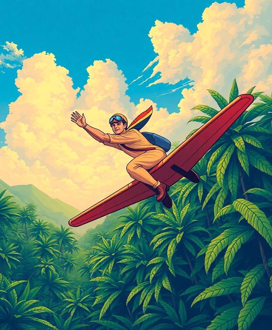 This design combines aviation excitement with lush tropical scenery, creating a unique pop culture artwork. The realistic descent scene captures dynamic movement and vibrant jungle colors.