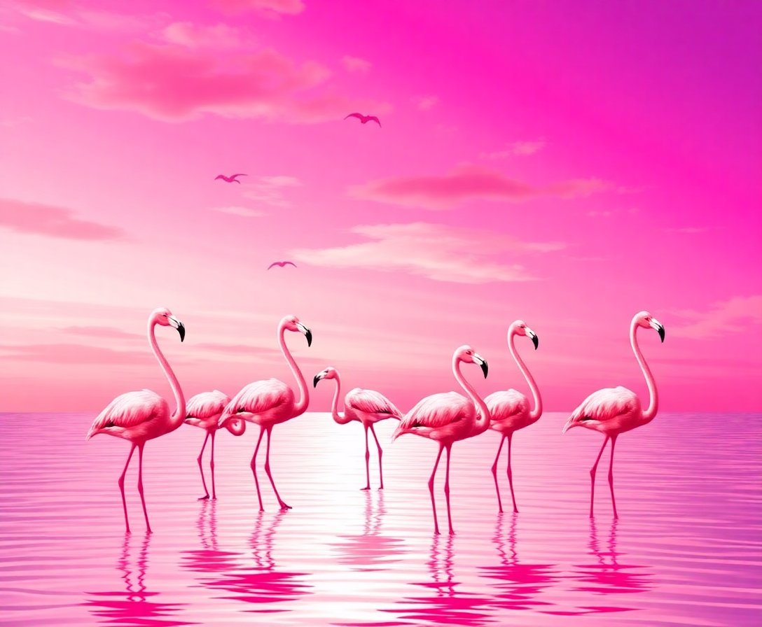 Ultimately, step back and admire your completed masterpiece showcasing elegant flamingos in their natural habitat. The finished piece captures the peaceful essence of tropical sunsets and wildlife photography.