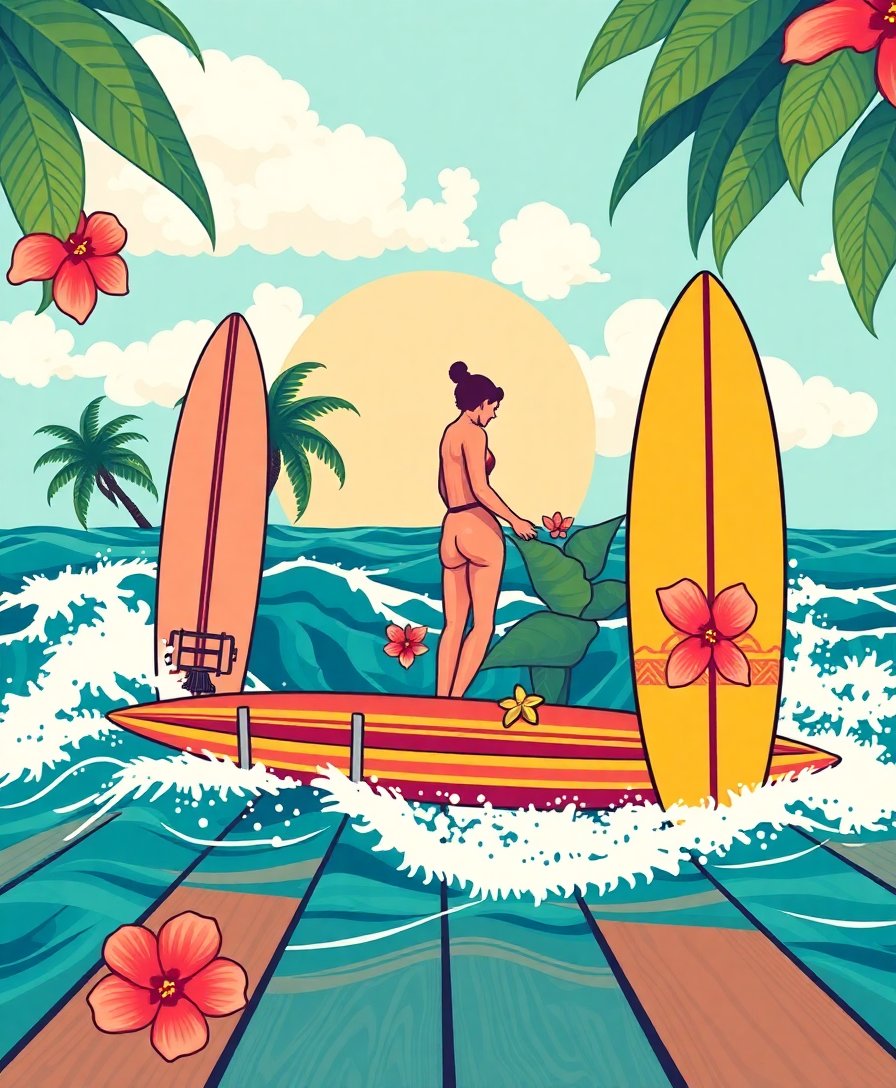 Ultimately, add finishing touches to the delicate plumeria petals using your small brush. Finally, step back and admire your completed retro surf artwork. Your handcrafted piece now radiates the warm, nostalgic charm of vintage beach culture.