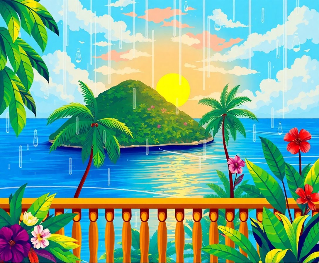 Transform your space with this captivating Rainy Island Balcony View Paint By Numbers kit. This atmospheric design captures the serene beauty of tropical rainfall viewed from an elegant balcony overlooking pristine island waters. Moreover, this paint by numbers masterpiece offers an immersive artistic journey into tropical paradise.