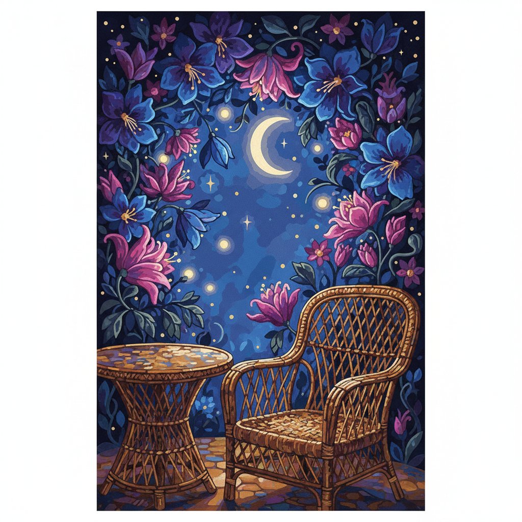 Transform your creative space with the enchanting Rattan Beneath Night Blooms Paint By Numbers kit. This captivating design celebrates the mystical beauty of tropical blooms beneath starlit skies. Moreover, every brushstroke brings you closer to creating your own masterpiece.