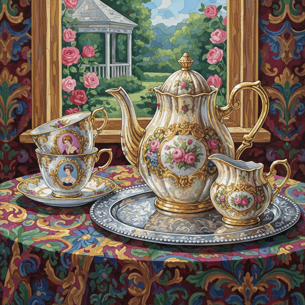 Transform your leisure time into an artistic journey with this exquisite Realistic Antique Tea Set Paint By Numbers. This captivating design features vintage teacups, delicate saucers, and ornate silverware bathed in gentle shadows. Each detail celebrates the timeless elegance of Victorian parlor scenes.