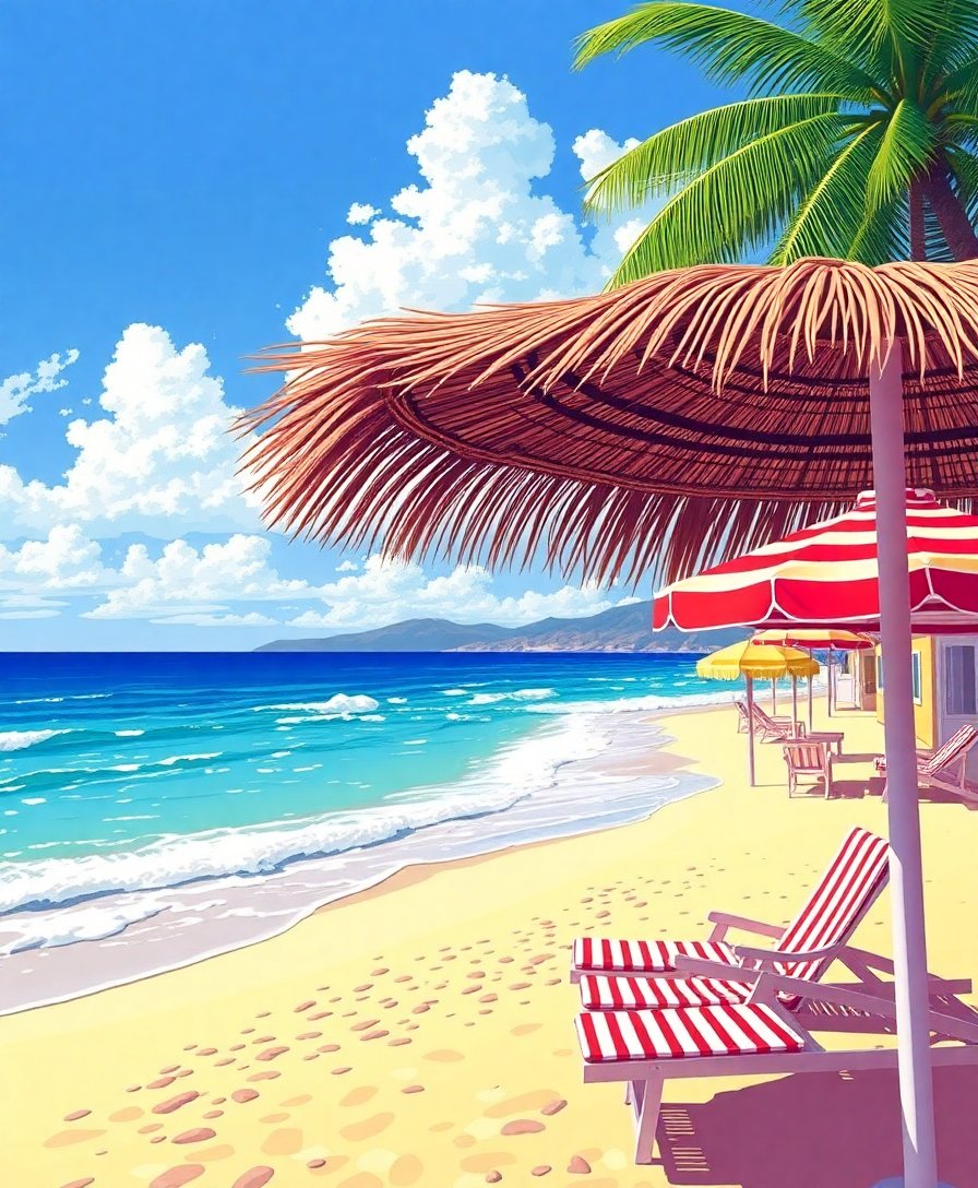 Ultimately, step back and admire your completed creation. The vibrant pop art elements blend seamlessly with realistic beach imagery. Moreover, your finished piece radiates the nostalgic charm of classic seaside advertisements.