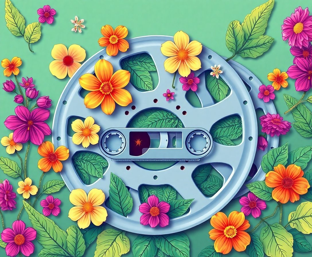 This unique artwork combines nostalgic audio culture with detailed botanical elements, creating a distinctive piece that appeals to music lovers and nature enthusiasts alike.