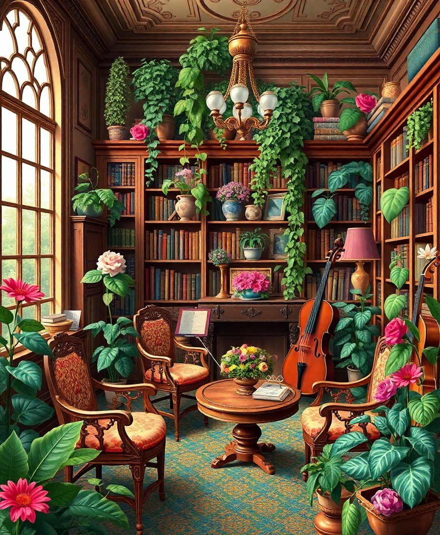 Transform your living space with the elegance of a cozy indoor masterpiece. This Realistic Botanical Music Parlor Paint By Numbers captures the sophisticated charm of a vintage music room adorned with lush tropical foliage and rich mahogany tones.