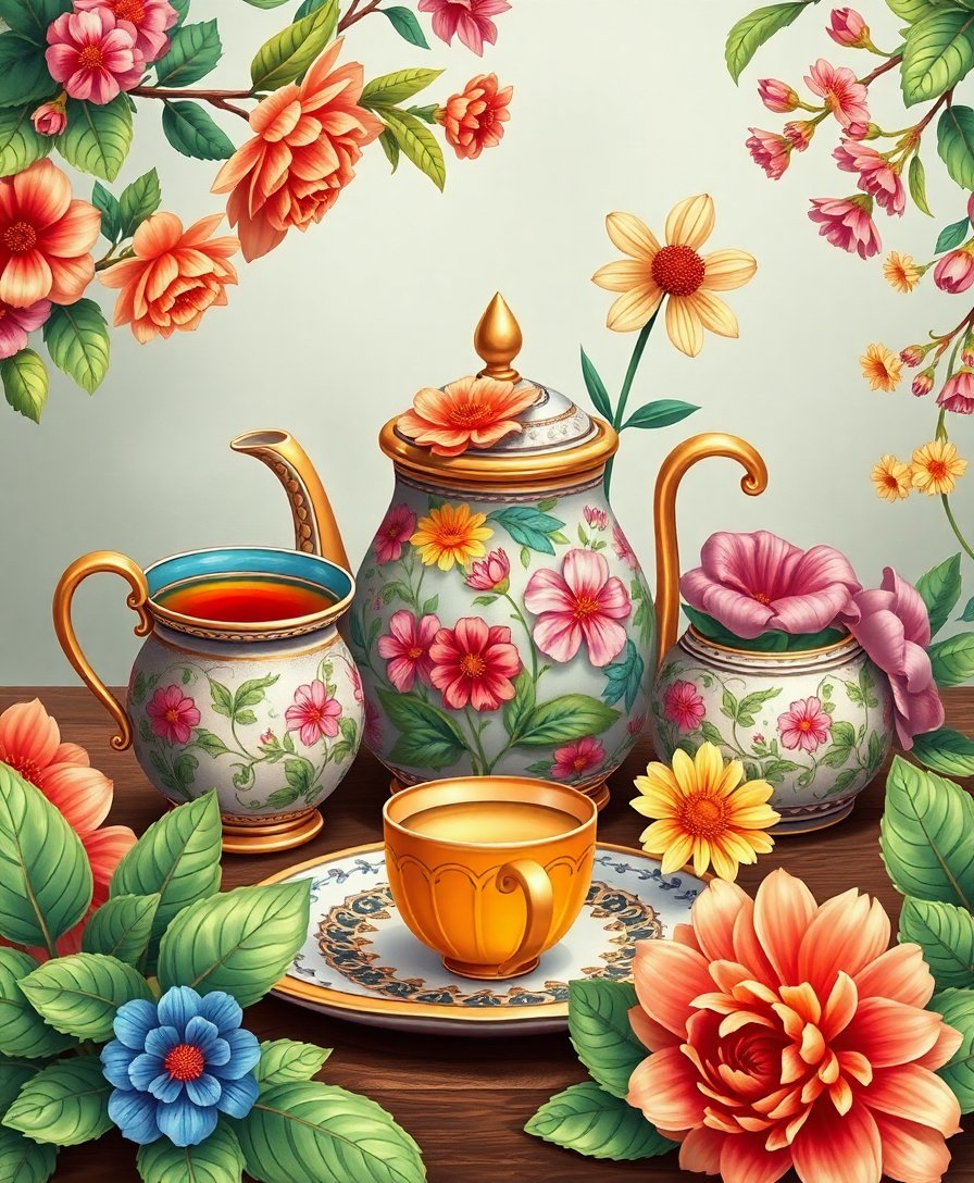 Ultimately, step back and admire your finished masterpiece displaying elegant teacups and botanical elements. Moreover, the realistic details create a stunning focal point for your cozy indoors space. Your completed artwork radiates warmth and sophistication.