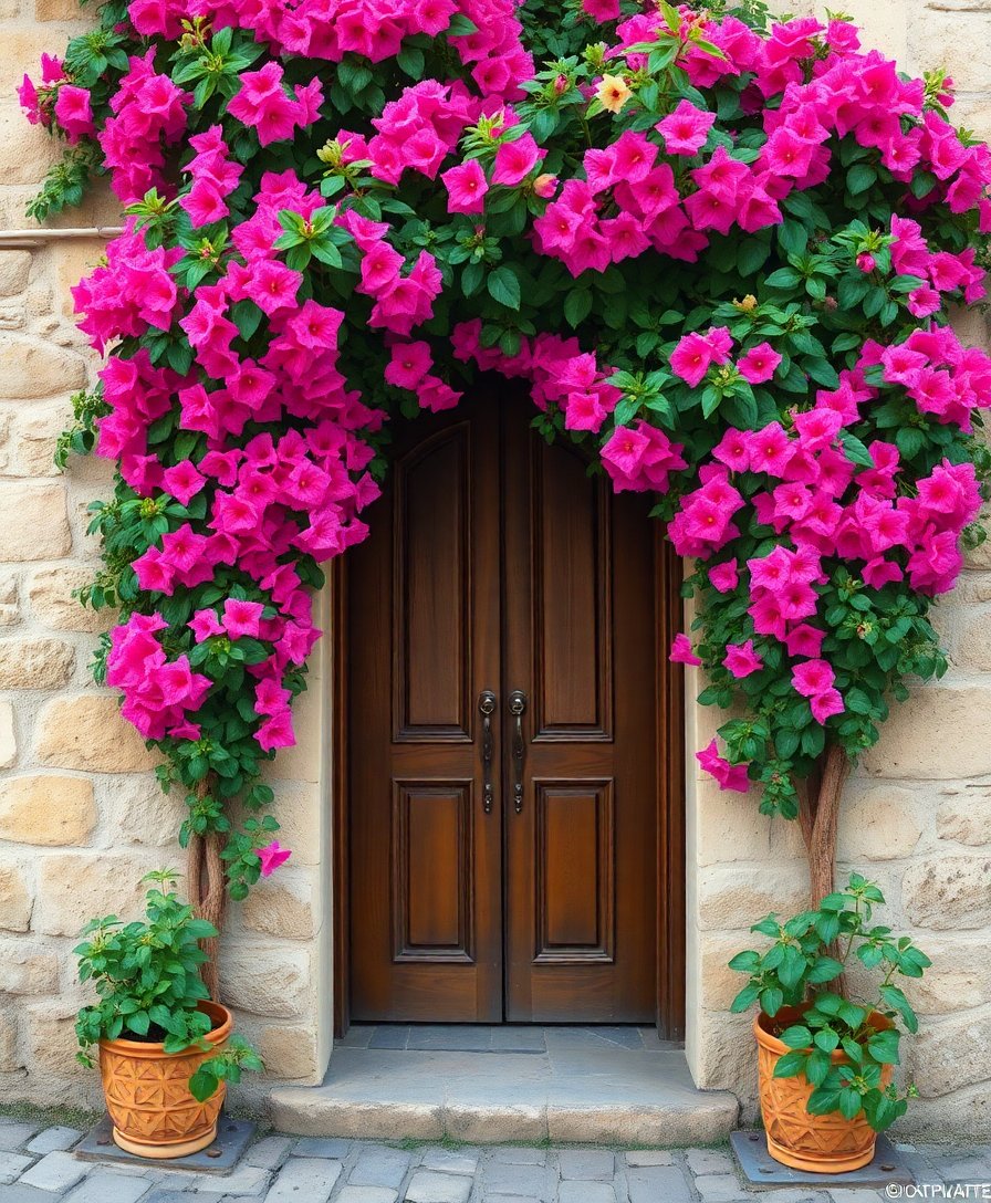 The realistic details capture authentic bougainvillea vines and weathered stone textures beautifully. The vibrant magenta blooms create stunning contrast against the aged doorway architecture.