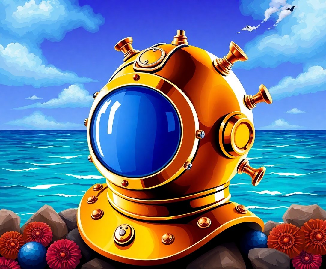 Transform your artistic journey with this captivating Realistic Brass Ocean Helmet Paint By Numbers design. This intricate kit brings the nostalgic charm of vintage diving equipment to life. Moreover, each brushstroke reveals stunning metallic details against oceanic backgrounds.