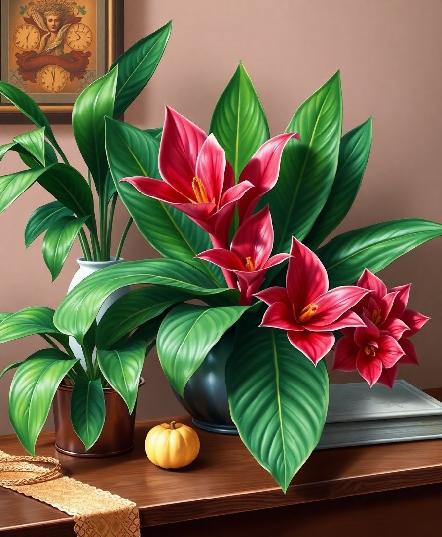 The realistic bromeliad scene features warm lighting and antique furniture details that create depth and sophistication. It’s perfect for adding classical elegance to any space.