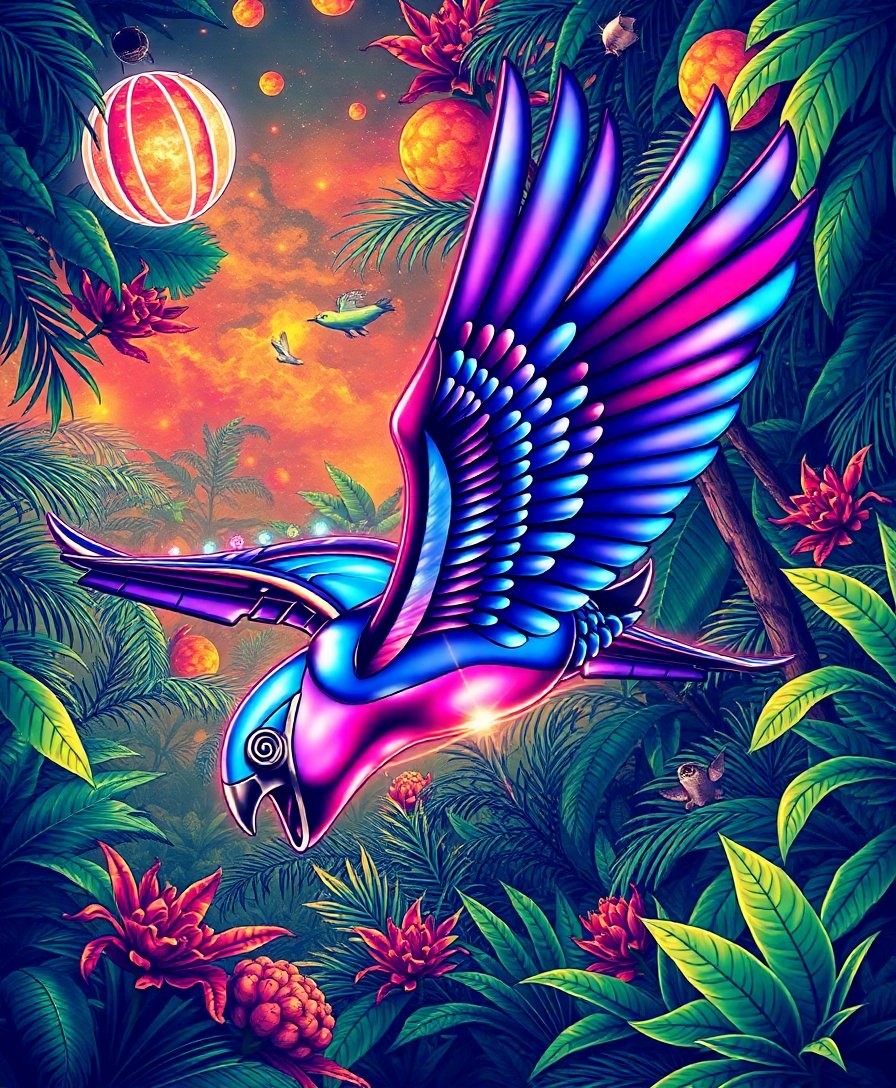 Embark on an extraordinary artistic adventure with this Realistic Chrome Jungle Flight Paint By Numbers masterpiece. This exceptional kit combines futuristic exploration themes with lush tropical greenery, creating a stunning retro-futuristic cosmos scene that captivates the imagination.