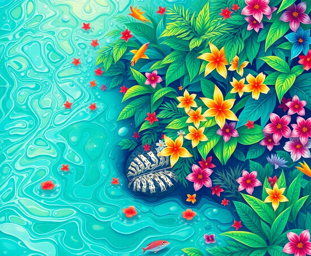 The realistic detail captures both serene ocean waters and delicate tropical petals with stunning accuracy. The turquoise tones create a calming atmosphere perfect for any living space.