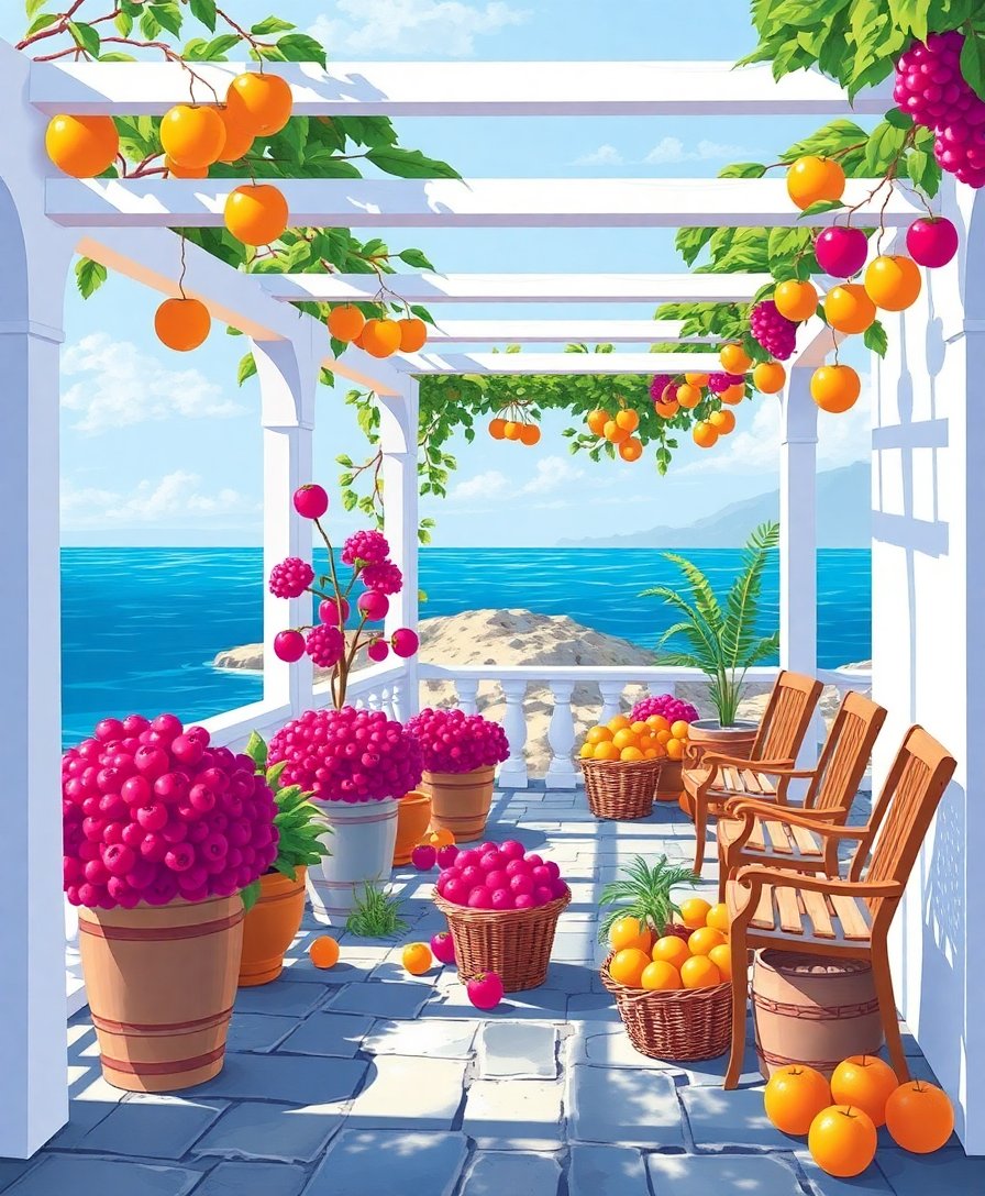 Ultimately, step back and admire your completed coastal masterpiece as the final details bring the veranda scene to life. The realistic fruit-laden branches and peaceful coastal backdrop create a stunning focal point. Therefore, your finished artwork deserves prominent display in your favorite living space.