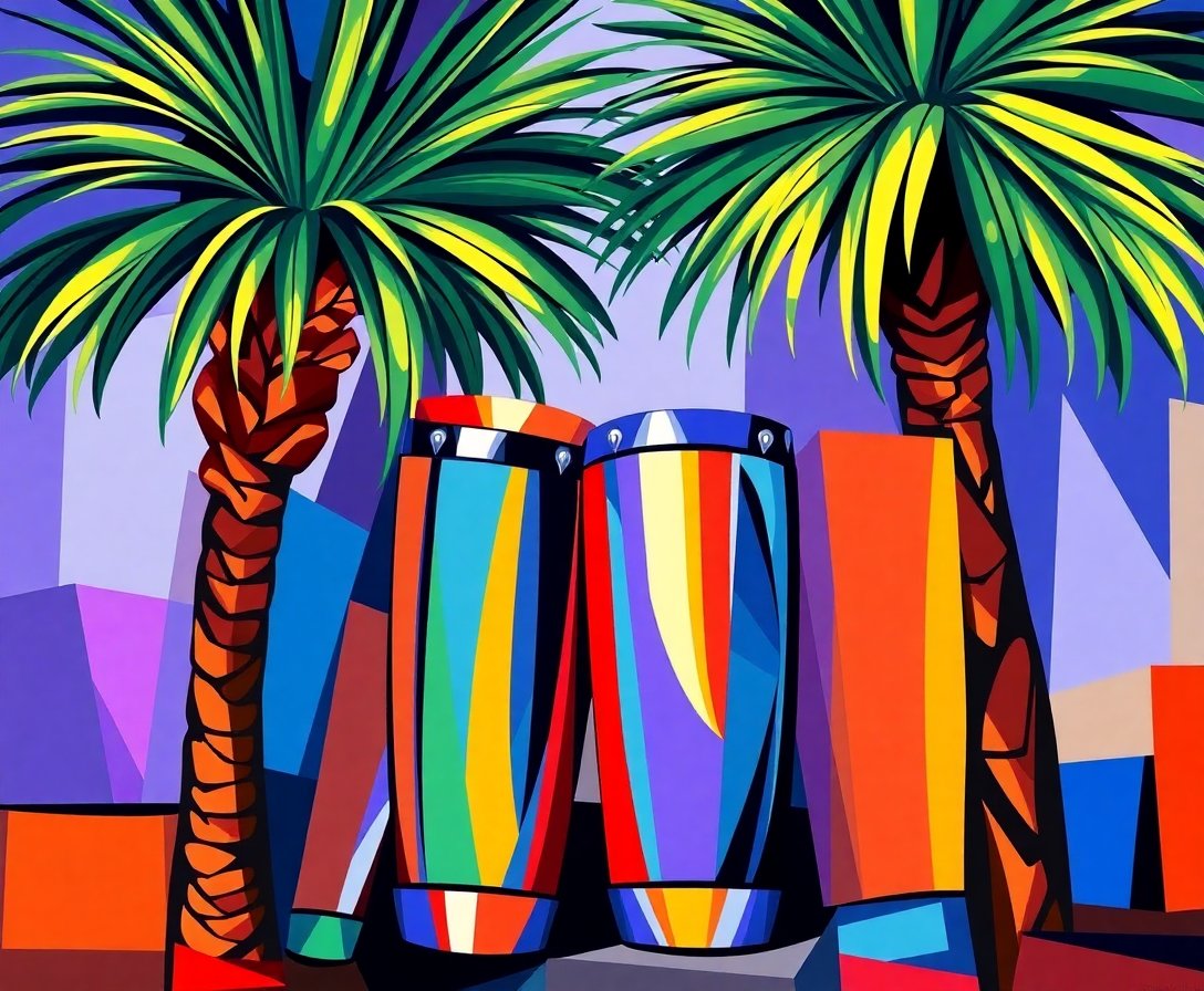 Ultimately, add the final details that define the percussion instruments and tropical elements. These finishing touches transform your canvas into a vibrant celebration of geometric abstraction and musical artistry.