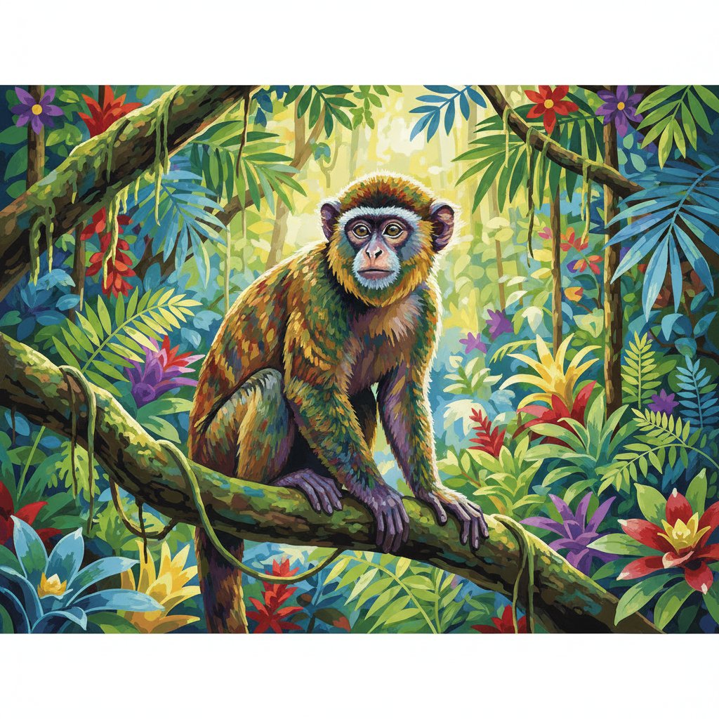 Transform your creative space with this captivating Realistic Dappled Rainforest Monkey Paint By Numbers. This stunning wildlife portrait captures the intricate beauty of a spider monkey surrounded by lush flora and filtered sunlight.