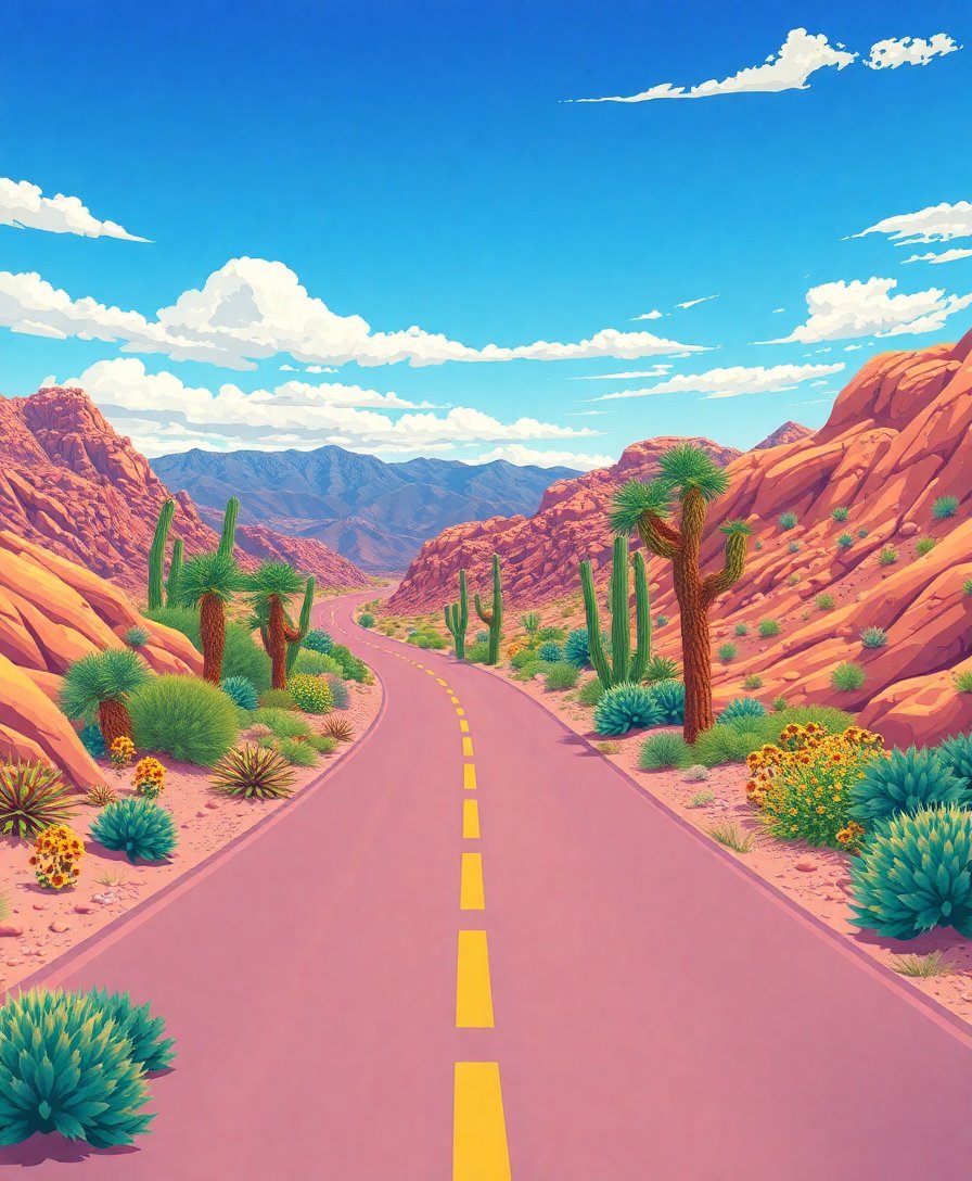 Ultimately, step back and admire your finished creation. The abandoned highway now bursts with life through your artistic vision. Display your completed work proudly, knowing you’ve captured the essence of desert beauty.