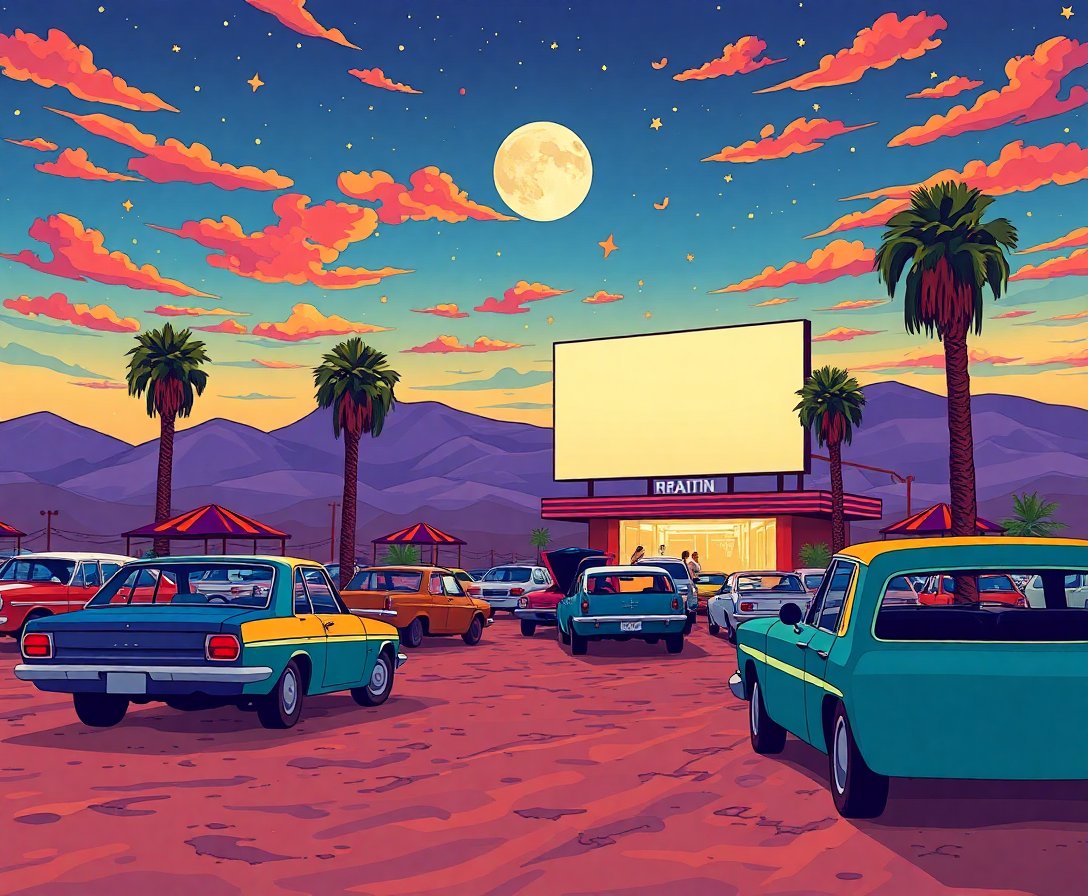 This design captures authentic vintage drive-in atmosphere with realistic outdoor signage details. The nostalgic entertainment theme creates a unique artistic experience that celebrates classic nightlife culture.