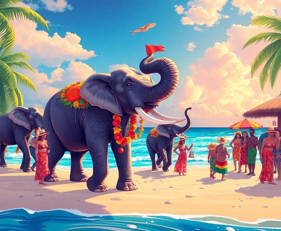 Ultimately, add final details and highlights to bring your elephant celebration to life. Step back frequently to admire your progress and make any necessary adjustments. Your completed artwork will showcase the vibrant energy of this tropical island festivity scene.