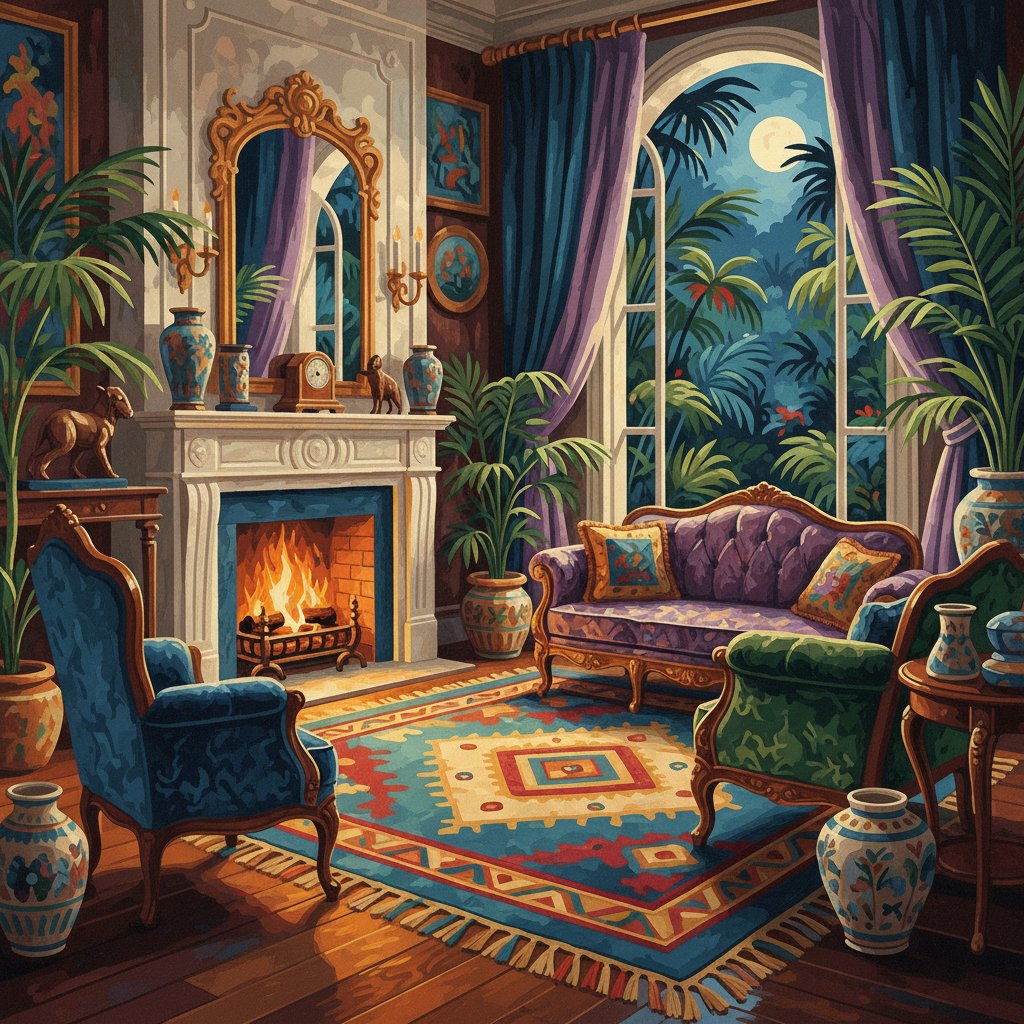 Ultimately, step back and admire your completed parlor scene as it captures the exotic warmth perfectly. Additionally, the finished painting radiates the authentic glow of a Victorian hearth. Finally, your artistic achievement becomes a focal point that transforms any room into a sophisticated sanctuary.