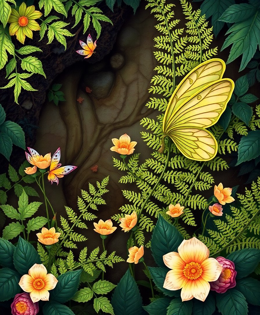 The sepia-toned palette and intricate fern details create timeless elegance. The mystical sprite elements add enchanting charm to traditional botanical art.
