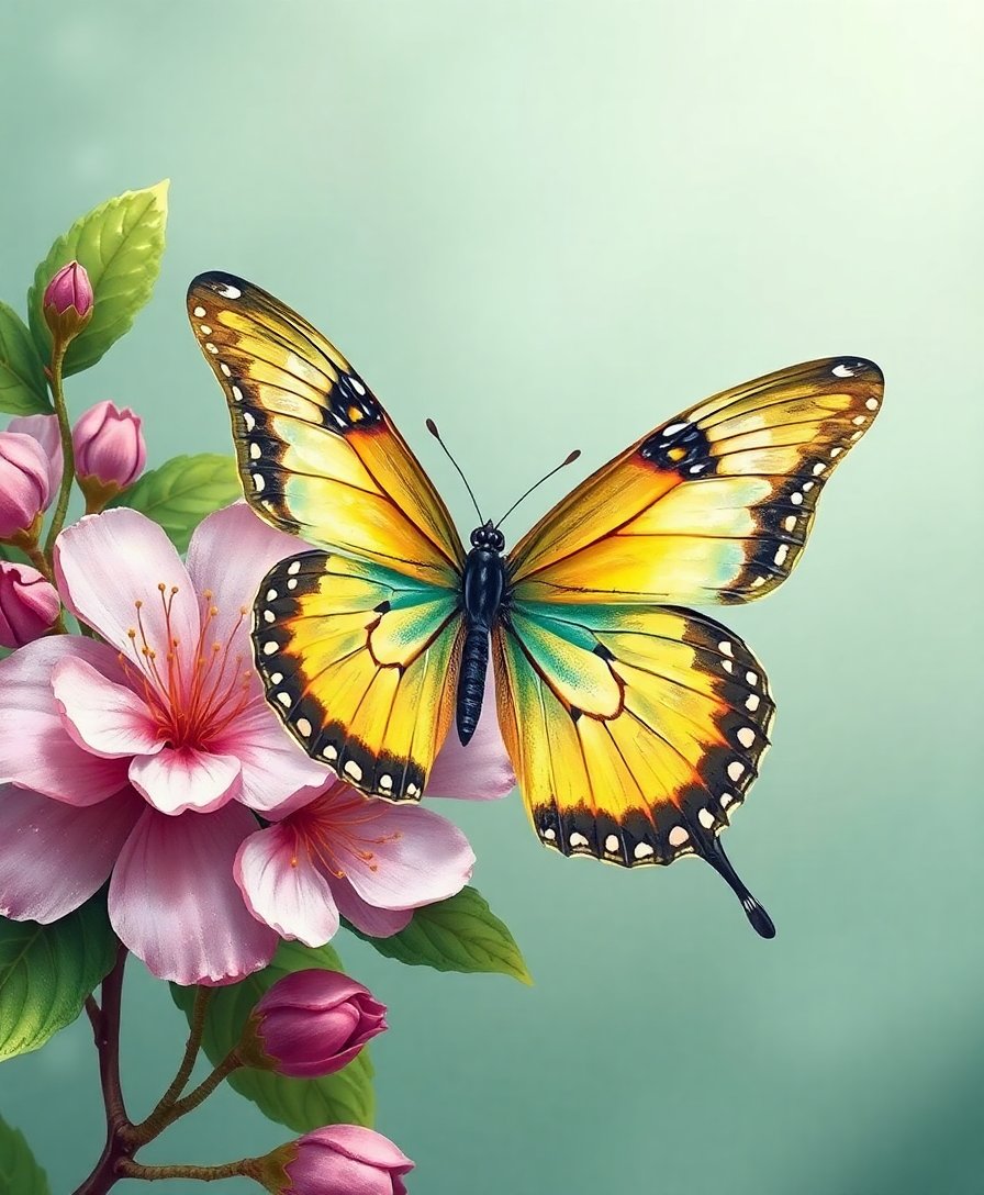 The transparent wings and aged blossom details create a sophisticated vintage aesthetic that captures nature’s delicate beauty. This botanical masterpiece combines realistic elements with artistic interpretation.