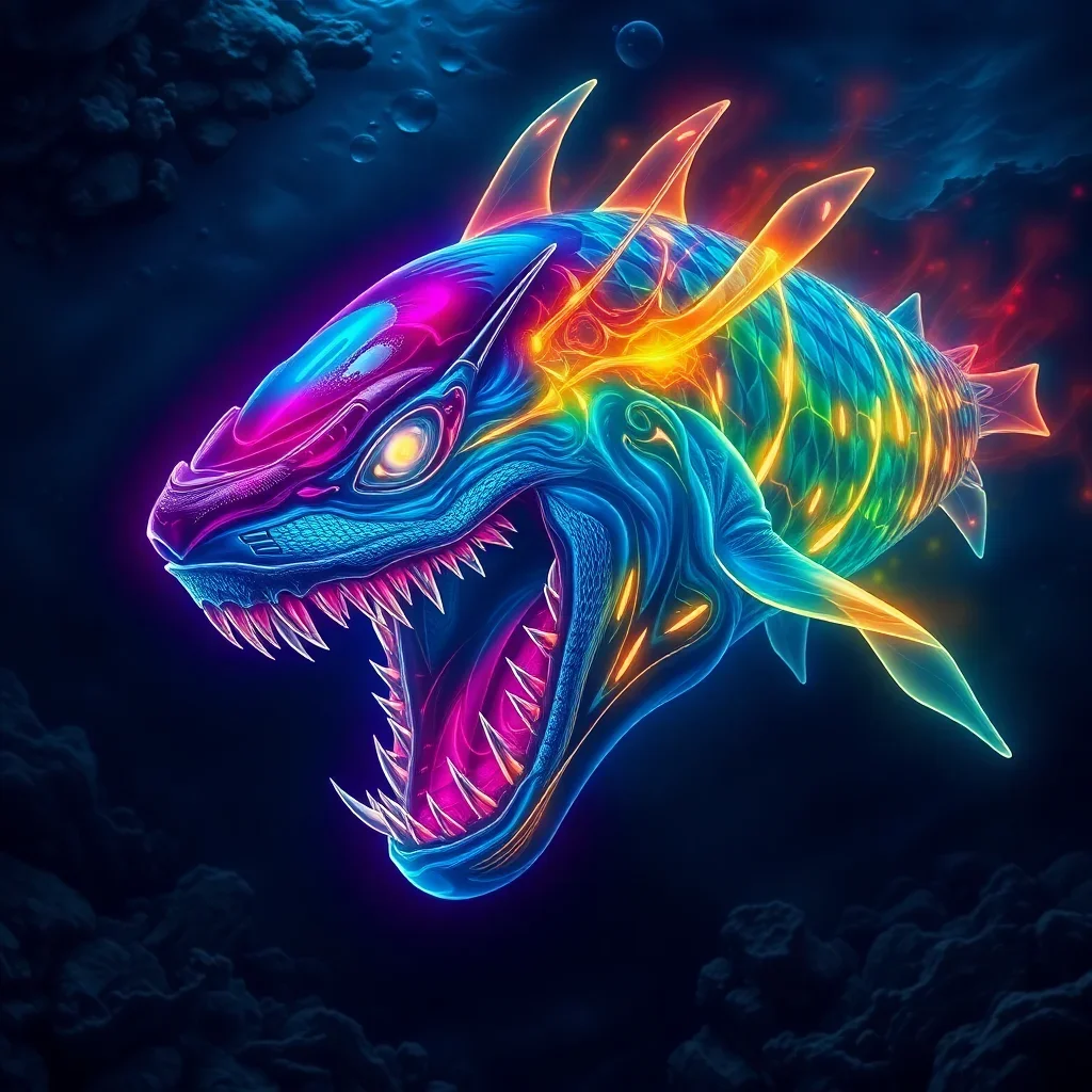 The luminescent highlights create a stunning visual effect that captures the essence of deep-sea bioluminescence. The carefully selected colors enhance the predator’s natural glow beautifully.
