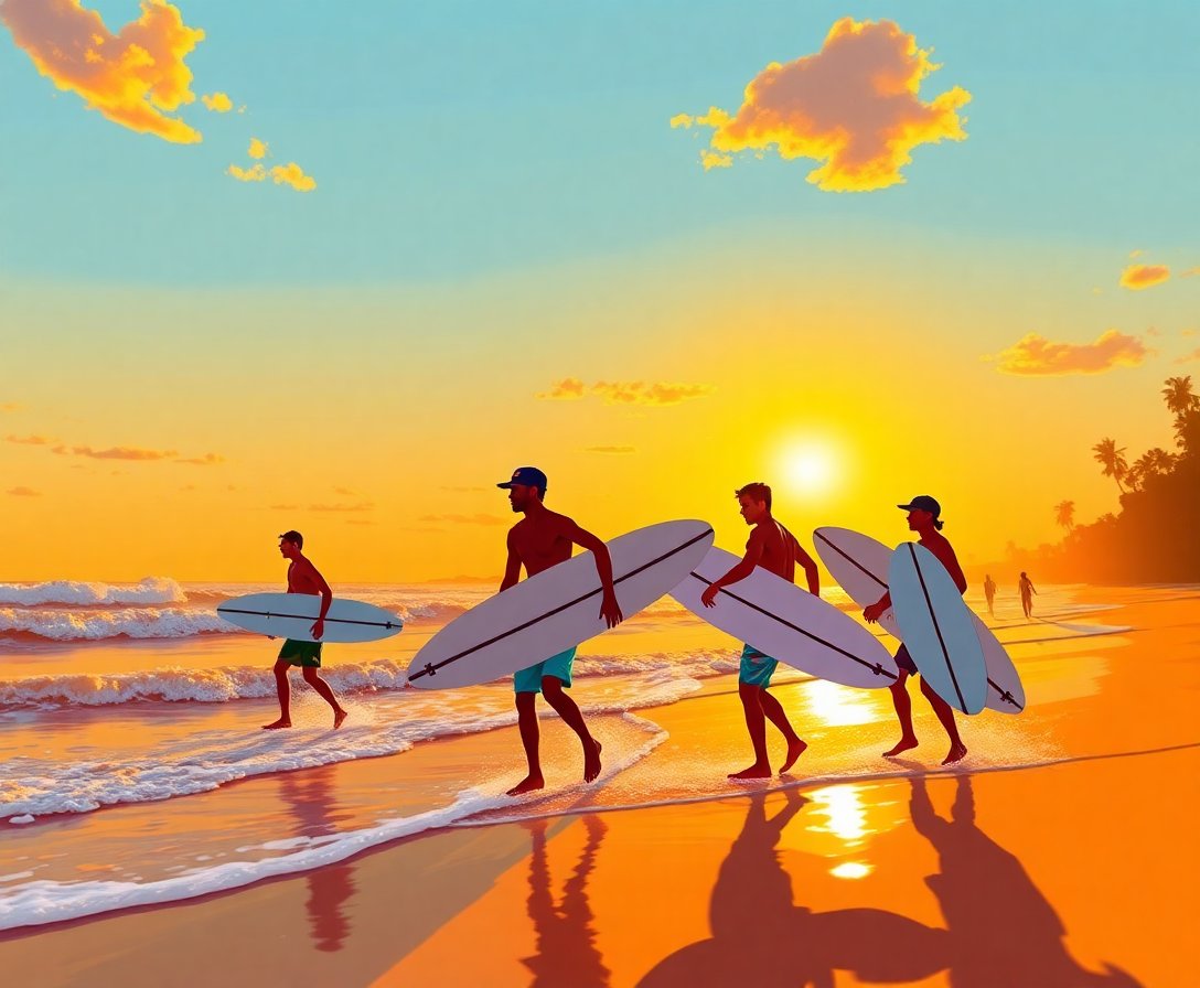 Ultimately, add the final surfboard details and silhouette touches. Your completed masterpiece showcases the serene beauty of surfers against a glowing horizon. Display your artwork proudly in any room.