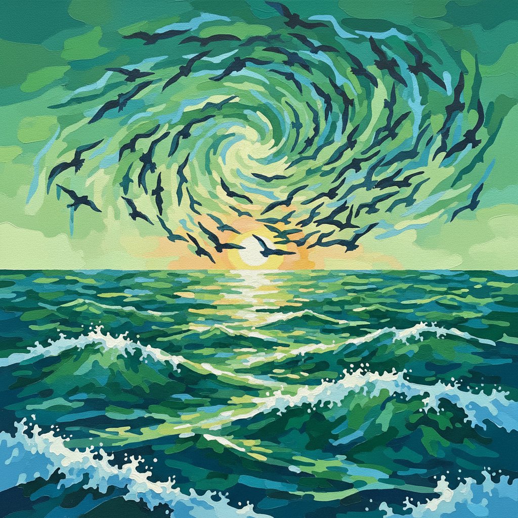 The realistic flock imagery combined with ocean elements creates a captivating scene that showcases both wildlife and natural landscapes. The teal and green color palette adds depth and tranquility to the composition.