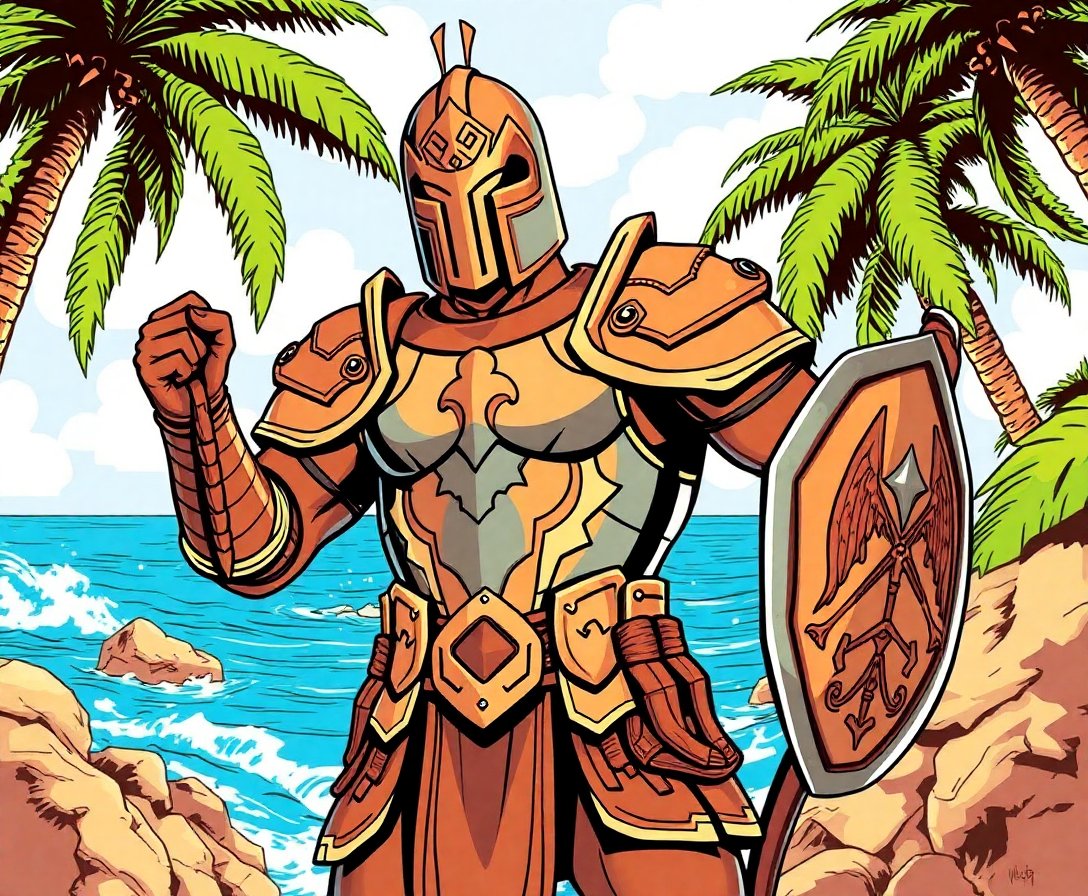 The combination of realistic armor texturing, patriotic themes, and island flora creates a unique artistic experience. The weathered effects and shadow work add professional depth to your finished piece.
