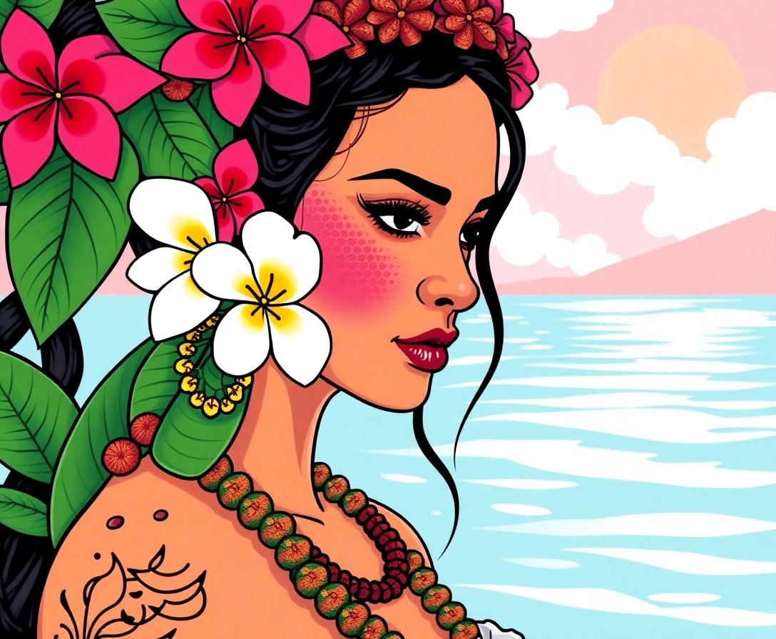This artwork beautifully combines realistic portraiture with traditional Polynesian elements like plumeria flowers and cultural motifs. The monochrome styling creates elegant contrast while honoring island heritage.