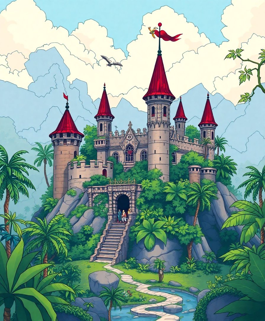Embark on this artistic adventure today and discover the magic within this legendary landscape. The combination of castle architecture and tropical elements creates an unforgettable painting experience that celebrates both history and nature’s beauty.
